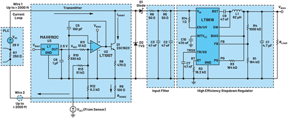 在遠程發送器終端,肖特基二極管(D1)可保護發送器免受反向電流的影響。在輸入端放置一個齊納二極管或TVS (D2)二極管可提供進一步的保護,從而限制與電流環路電感成正比的瞬態電壓浪涌。LT8618高效單片降壓穩壓器將環路電壓降低至5.5V或3.3V,為基準、DAC以及其它功能單元供電。