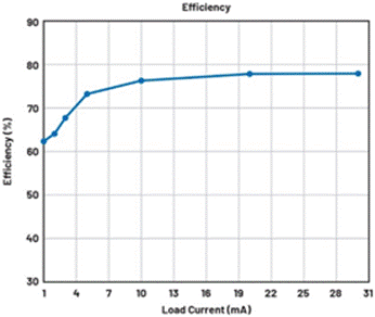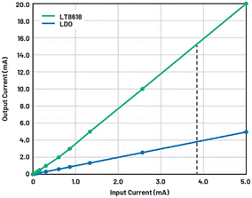 典型的電流環路會限制為整個遠程發送器供電的電源電路的輸入電流,LDO穩壓器的可用負載電流不能超過該輸入限流值。另一方面,降壓穩壓器可以使提供給負載的輸入電流成倍增加。圖3顯示了從24V輸入電壓轉換為5.5V輸出時LT8618穩壓器的輸出電流與輸入電流的關系。對于3.8mA的輸入限流值,輸出電流差不多為15mA。這部分額外的電力可增加操作余量和啟用額外功能單元,簡化了系統設計人員的工作。
