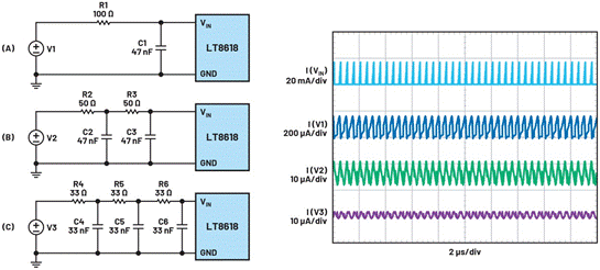 通過LTspice®仿真,可以比較三種不同輸入濾波器結構在源電纜側的電流紋波,輸入路徑中串聯的總電阻為100Ω,使用LT8618(VIN = 28V,VOUT = 5.5V)以及82µH電感。電流脈沖相當于被輸入濾波器視為LT8618穩壓器輸入電流的值,此時輸出電流為10mA。