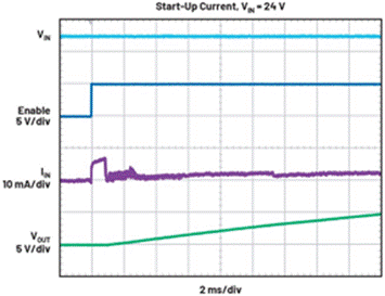 功率調節器的輸入端與電流環路相連,因此,除了穩態限流外,在啟動或負載瞬變期間限制紋波電流和沖擊電流也很重要。功率轉換器啟動期間的沖擊電流取決于給定軟啟動時間內輸入電容和輸出電容的大小。這就需要權衡取舍:盡量減小輸入電容,防止產生大的沖擊電流,同時又要使其足夠大,以保持可接受的低紋波。