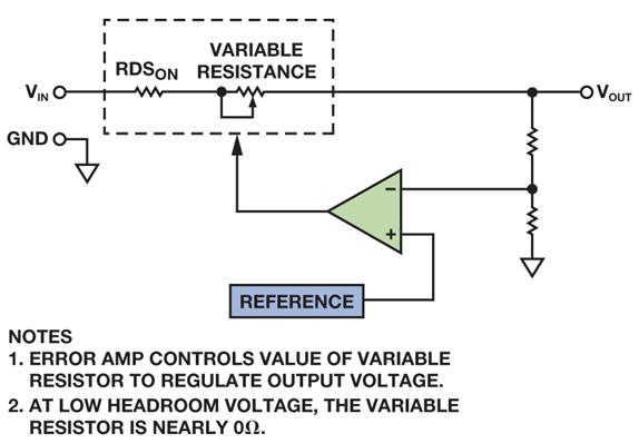 客戶經常會就LDO在壓差模式下的PSRR請教應用工程師。開始時,這似乎是個合理的問題,但只要看看簡化的框圖,就知道這個問題毫無意義。當LDO工作于壓差模式時,調整FET 的可變電阻部分為零,輸出電壓等于輸入電壓與通過調整FET 的RDSON的負載電流導致的壓降之差。LDO不進行調節,而且沒有增益來抑制輸入端的噪聲;只是充當一個電阻。FET的RDSON與輸出電容一起形成一個RC濾波器,提供少量殘余PSRR,但一個簡單的電阻或鐵氧體磁珠即可完成同一任務,而且更加經濟高效。