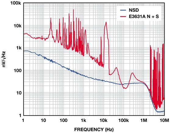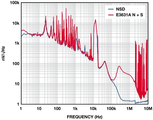 圖4 展示的是2.5 V ADM7160在500 mV裕量和100 mA負載條件下,相對于E3631A臺式電源的輸出噪聲,該臺式電源在20 Hz至20 MHz范圍內的額定噪聲低于350 μV-rms。1 kHz以下的許多雜散為與60 Hz線路頻率整流相關的諧波。10kHz以上的寬雜散來自產生最終輸出電壓的DC-DC轉換器。1 MHz以上的雜散源于環境中與電源噪聲不相關的RF 源。在10Hz至100kHz范圍內,這些測試所用電源的實測噪聲為56 μVrms,含雜散為104μV。LDO抑制電源上的所有噪聲,輸出噪聲約為9 μV-rms。
