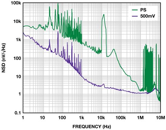 當裕量電壓降至200 mV時,隨著高頻PSRR接近0 dB,100 kHz以上的噪聲雜散開始穿過噪底。噪聲略升至10.8 μV rms。隨著裕量降至150 mV,整流諧波開始影響輸出噪聲,后者升至12μVrms。在大約250 kHz 處出現幅度適中的峰值,因而盡管總噪聲的增加量并不大,但敏感電路也可能受到不利影響。隨著裕量電壓進一步下降,性能受到影響,與整流相關的雜散開始在噪聲頻譜中顯現出來。圖5所示為100-mV裕量條件下的輸出。噪聲已上升至12.5 μV rms。諧波所含能量極少,因此,雜散噪聲只是略有增加,為12.7 μV rms。