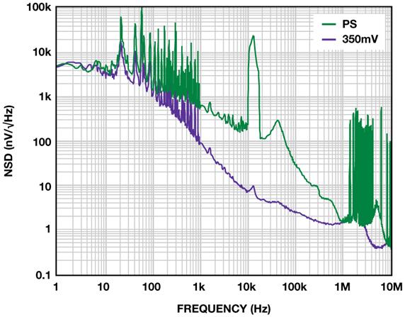 當裕量為350 mV時,LDO采用壓差工作模式。此時,LDO再也不能調節輸出電壓,充當一個電阻,輸出噪聲升至近76 μV rms,如圖9所示。只有FET的RDSON和輸出端的電容形成的極點衰減輸入噪聲。