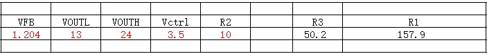 VOUTH=24,VOUTL=13,VFB=1.204,R2=10K,把相關參數填入以上表格,自動計算出另外兩個匹配電阻: