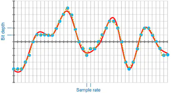 圖 1:通過以既定頻率和比特率采樣進行數字化的模擬聲音。提高采樣率和比特深度可以確保數字化的信息更接近模擬信號,并提高再現質量。(圖片來源:Knowles)
