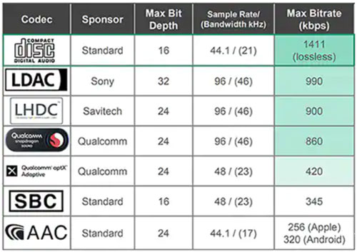 表 1:“無損”編解碼器(Sony、Savitech 和 Qualcomm)與 CD 質量和有損編解碼器(Qualcomm 和藍牙技術聯盟 (SBC))的比較。請注意,無損編解碼器的最大比特率受限于藍牙無線鏈路的能力。(圖片來源:Knowles)