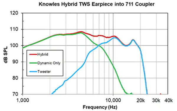 圖4:將揚聲器系統分成動態低音單元(綠色)和 BA 高音單元(藍色)產生了平坦的頻率“混合”響應(紅色)(圖片來源:Knowles)