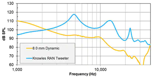 圖 7:圖中所示為 Knowles 的 BA 高音單元與動態揚聲器的高頻響應比較。(圖片來源:Knowles)