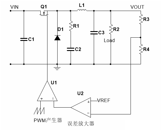 普通的buck變化器結構如圖所示,VIN為DC輸入電壓,C1為輸入電容,Q1為MOSFET開關,D1為buck結構中必須的二極管,在同步降壓芯片中D1也是MOSFET,可以提高效率和降低成本。R1,C1不是必須的,RC吸收電路能提高EMI性能。L1為儲能電感,C3為輸出電容,R3,R4,U2,U1組成反饋環路,R3和R4設定輸出電壓。