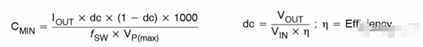 輸入電容的目的是減小輸入紋波,輸入紋波需要控制在75mv(0.5%)以內。式中Cmin表示最小輸入電容,單位為uF;Iout表示輸出電流;fsw表示開關頻率,VP(max)表示輸入的最大峰峰值電壓。