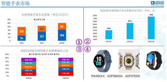 智能手表行業是近幾年少有的在消費類市場上持續保持穩步上升的。從2020年到2022年,總出貨量呈兩位數增長,品牌占比也有所增長。中國智能手表市場份額占28%,位居榜首,歐、美在下降,印度在上升。從中可以看出國人對智能手表包括對健康的領域關注程度很高。