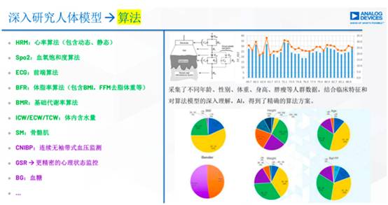 ADI的傳感器分為兩大部分:一是光路部分。通過血管收縮膨脹產生的變化,對反射光采集信息做出判斷,可用于采集心率信息。這個部分極具難度,因為每個人胖瘦不同,手表佩戴的松緊不同,膚色不同,包括體毛、紋身、傷疤等因素都能影響采集精準度。ADI在模擬領域深耕近60年,能提供極高的信噪比,保證信號質量和可測覆蓋度。在不同情況下,比如漏光、環境光的干擾、動態光的偽像,ADI也可以提供一整套方案進行動態干擾抑制,可適配更多的環境、測試狀態。此外,ADI還提供穩定的算法,自適應的算法,以及應用機器學習的理論。