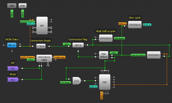 參照圖2中GreenPAK內部的可配置單元圖示,為了確保不丟失任何數據,我們需要將SPI時鐘延遲半個時鐘周期,以便SPI功能塊在正確的時間被計時。我們通過使用CNT6、2-bit LUT1和OSC功能塊的外部時鐘來實現這一點。CNT6的輸出直到DFF0被計時后52 µs才會變高,是該SPI的SCLK周期104 µs的一半。當CNT6為高(HIGH)時,配置為與門的2-bit LUT1允許時鐘信號(CLK Begin)進入OSC 的EXT. CLK0輸入,其輸出時鐘信號連接到CNT0的CLK端子。
