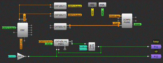 參照圖3中GreenPAK內部的可配置單元圖示,PWM信號是使用PWM0和相應時鐘脈沖發生器(CNT8/DLY8)生成的。由于脈沖寬度是用戶可控的,我們使用FSM0(可以連接到PWM0)來統計用戶數據。