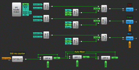如果禁用手動模式并開啟自動混合模式,則顏色每500毫秒改變一次,上升沿來自CNT7。4-bit LUT1 用于防止D0 D1 D2處于“000”狀態,因為該狀態會導致燈在自動混合模式時關閉。