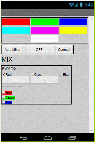 在本節中,我們將創建一個安卓應用程序,它將監測和顯示用戶的控件選擇。界面由兩部分組成:第一部分包含一組具有預定義顏色的按鈕,因此當按下這些按鈕中的任意一個時,相應顏色的LED會亮起。第二部分(MIX方塊)為用戶創建混合顏色。