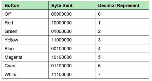 前三個bit:B0、B1和B2將通過預定義顏色的按鈕在直接控制模式下保持RGB LED的狀態。因此,當單擊其中任意一個按鈕時,將發送該按鈕的相應值,如表2所示。