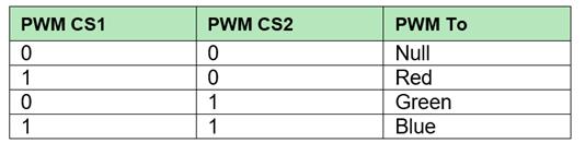 在第一部分,用戶選擇他們希望PWM信號通過的LED引腳;PWM信號一次只能傳遞到一個引腳。下面的列表在PWM模式期間邏輯地控制其他兩種顏色的開/關。