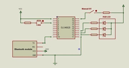 為了創建這個項目,我們將使用SLG46620 GreenPAK IC、一個藍牙模塊和一個RGB LED。