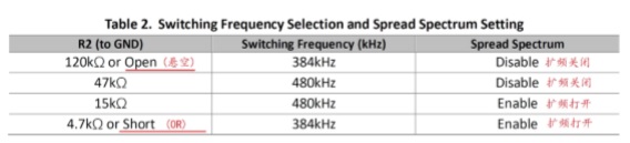 ACM3128A  pin6(FREQ/SS)用來設置開關頻率以及擴頻模式,接一個電阻到地,不同電阻 對應不同開關頻率以及擴頻是否打開,四個模式。