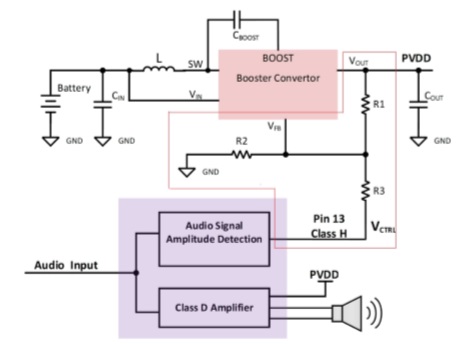 2.  pin13 AD52090 pin13(NC)空腳。 ACM3128A pin13(CLASS H)動態升壓 FB 控制腳。通過一個電阻接到外圍升壓 IC 的 FB 腳, 實現動態升壓。具體參數計算參考附件 EXCEL 電子表格自動計算公式。