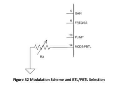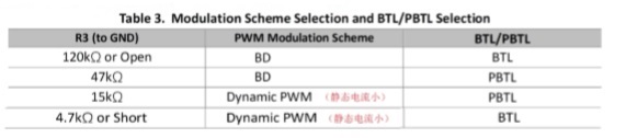 3.  pin14 AD52090 pin14(PBTL)用來設置雙聲道(BTL)以及單聲道(PBTL)工作模式。 低電平:雙聲道(BTL); 高電平:單聲道(PBTL) ACM3128A pin14(MODS/PBTL)用來設置調制模式以及雙聲道(BTL)以及單聲道(PBTL)工 作模式。接一個電阻到地,不同電阻對應四個模式。