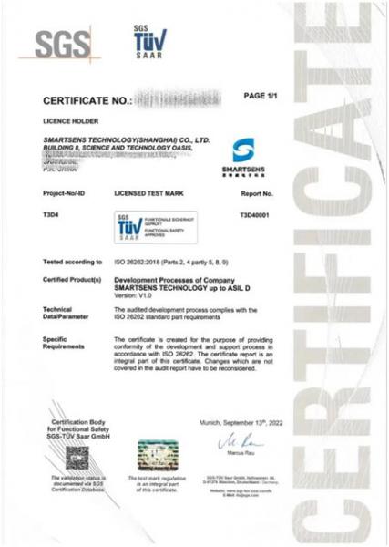 思特威已于本月8日成功獲得ISO 26262:2018汽車功能安全流程ASIL D認證證書,這也是思特威在精進車規(guī)安全開發(fā)體系與流程、打造先進車規(guī)級芯片、推動智能汽車行業(yè)高質(zhì)量發(fā)展等方面取得的實效。