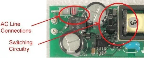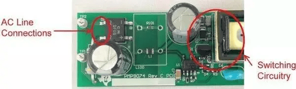 輸入連接從左側進入,到達距漏極連接1cm以內的位置。這就是故障點,在這里FET的開關電壓波形可以繞過EMI濾波器耦合至輸入。