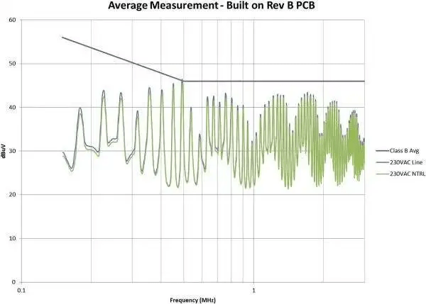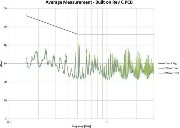 這是一條令人關注的曲線,因為它反映出了幾個問題:明顯超出了規范要求的較低頻率輻射、共模問題通常很明顯的1MHz至2MHz組件,以及較高頻率組件的衰減正弦(x)/x分布。需要采取措施讓輻射不超出規范。我們利用通用電容公式將其降低了: