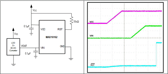真正的無毛刺監控器可以通過復位吸入電流,即使當VCC為零時也會將復位引腳強制拉到接地電位。圖6顯示了一種真正無毛刺監控器的示例電路。ADI的MAX16161/MAX16162無需任何外部組件即可實現無毛刺工作,小巧且經濟。