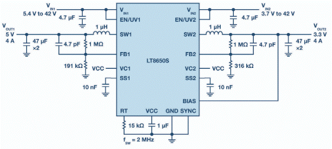 圖1.簡化的LT8650S原理圖在2 MHz時提供5 V/4 A輸出和3.3 V/4 A輸出。