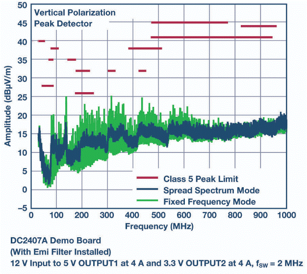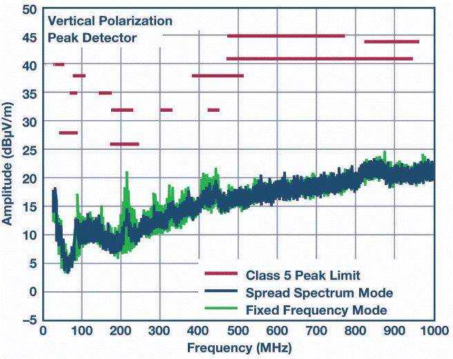 有關排放輸出特性,請參見圖4。這種改進的EMI/EMC性能對電路板布局不敏感,即使在使用2層PC板時也能簡化設計并降低風險。LT8645S可在整個負載范圍內輕松通過汽車CISPR 25,5類峰值EMI限制。擴頻頻率調制也可用于進一步降低EMI水平。
