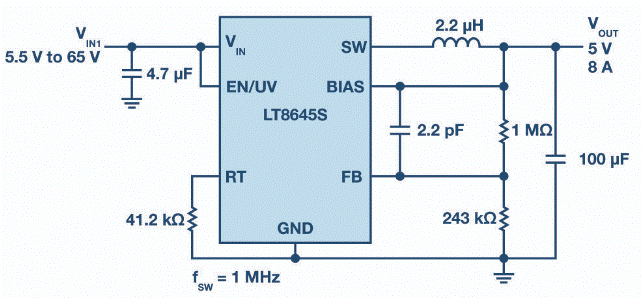 圖3.簡化的LT8645S原理圖,在2 MHz時提供5 V/8 A輸出。
