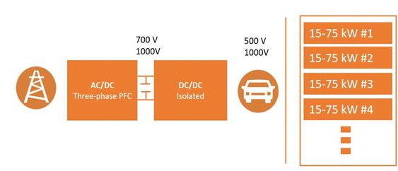 另一個影響設計和功率器件額定電壓的重要因素是架構中的級數。6個開關的拓撲結構是一個2級架構,通常用900 V或1200 V的開關來實現快速直流電動車充電器。這里SiC MOSFET-模塊具有低RDS on(6-40 mQ)區域的首選解決方案,特別是對于每塊15 kW以上的高功率范圍。