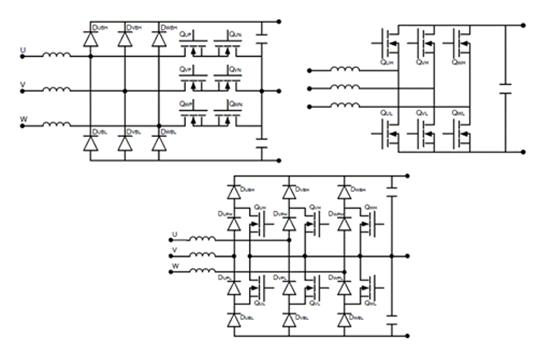 圖2.用于DCFC的典型PFC升壓拓撲結構.T-NPC(左上)、6開關(右上)和I-NPC(底部)