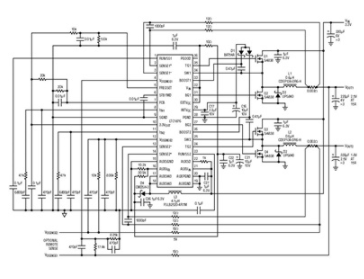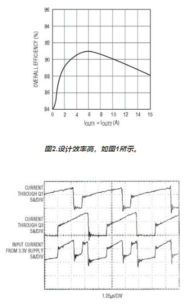 圖1所示為采用3.3V輸入提供2.5V/15A和1.8V/15A的設計。因為 LTC1876 為 MOSFET 柵極驅動提供了一個 5V 偏置,所以 RDS(ON)MOSFET Si4838 (典型值為 2.4mΩ) 可用于實現高效率。圖2顯示,在很寬的負載范圍內,總效率高于90%。