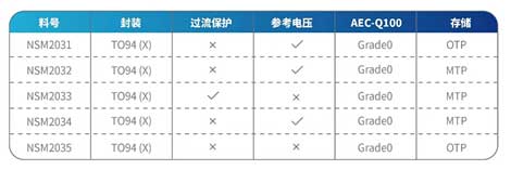 NSM203x產(chǎn)品系列包含了5個(gè)產(chǎn)品型號(hào),即NSM2031、NSM2032、NSM2033、NSM2034和NSM2035。考慮過流保護(hù)輸出、參考電壓輸出、存儲(chǔ)器類型(單次可編程OTP、可重復(fù)編程MTP)、封裝形式等多個(gè)維度,NSM203x系列可以全面覆蓋各個(gè)應(yīng)用場(chǎng)景下的不同系統(tǒng)需求。各產(chǎn)品類型均有車規(guī)和工規(guī)型號(hào),其中車規(guī)級(jí)別產(chǎn)品滿足AEC-Q100 Grade 0的可靠性要求,可在-40~150℃的嚴(yán)苛環(huán)境下勝任工作。