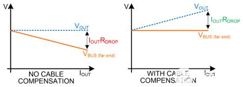 通過實施壓降補償來解決后排乘客座椅中由于長電纜引起的電纜電壓降,其中檢測輸出電流并將電流信息反饋到轉換器的內部反饋模塊。MAX25432/MAX25430補償壓降可達516m?來自從 OUT 引腳到用戶電纜的寄生電阻。這包括但不限于 USB 固定電纜、PCB 走線和內聯連接器。電纜補償設計用于高達 5A 的恒壓區域。電纜補償在進入MAX25432的PPS限流區域時保持工作狀態。