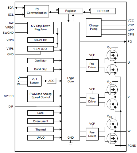 The DRV10987 device uses a proprietary sensorless control scheme to provide continuous sinusoidal drive,which significantly reduces the pure tone acoustics that typically occur as a result of commutation. The interfaceto the device is designed to be simple and flexible. The motor can be controlled directly through PWM, analog, orI2C inputs. Motor speed feedback is available through both the FG pin and the I2C interface simultaneously.