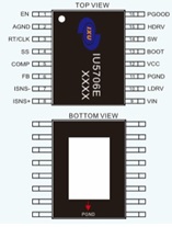 1、采用IU5706高效同步升壓控制器。此芯片4.5V-24V輸入電壓(涵蓋2-5節鋰電、鉛酸電池作為電源的應用),輸出電壓最高36V,并且能夠為負載提供8A持續電流,效率高達96%,采用EQA-16封裝。