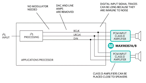 由于其高效率和出色的EMI性能,無濾波器數字輸入D類放大器已成為消費電子設備中驅動揚聲器的公認標準。這是因為它們不受與模擬對應物相關的電路板設計問題的影響,最具體地說是信號完整性。單通道數字D類放大器可以放置在電路板上的遠程位置,以最大限度地減少大電流電池和揚聲器負載連接的布線。這些放大器不需要模擬輸入D類設計所需的DAC和線路驅動器。因此,空間和系統成本下降,設計變得更加簡單。許多D類放大器接受脈沖編碼調制(PCM)或I類放大器2需要三根導線的 S 數據:BCLK、LRCLK 和 DIN(圖 2)。PCM 數據格式不需要調制器或應用處理器上數據的上采樣來提供立體聲數據。