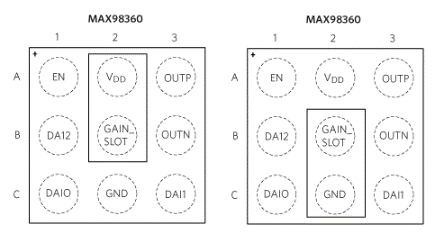 該 IC 還具有其他一些顯著優勢,有助于最大限度地減小電路板尺寸/成本。首先,它有1.9毫米的微小尺寸。29 引腳 WLP 具有巧妙的引腳布局,旨在消除對昂貴電路板過孔的需求。如圖4所示,GAIN_SLOT引腳(位于封裝中心)可以方便地連接到VDD或 GND(直接或使用電阻器)或保持未連接狀態,以提供 I2S/左對齊增益設置如表1所示。