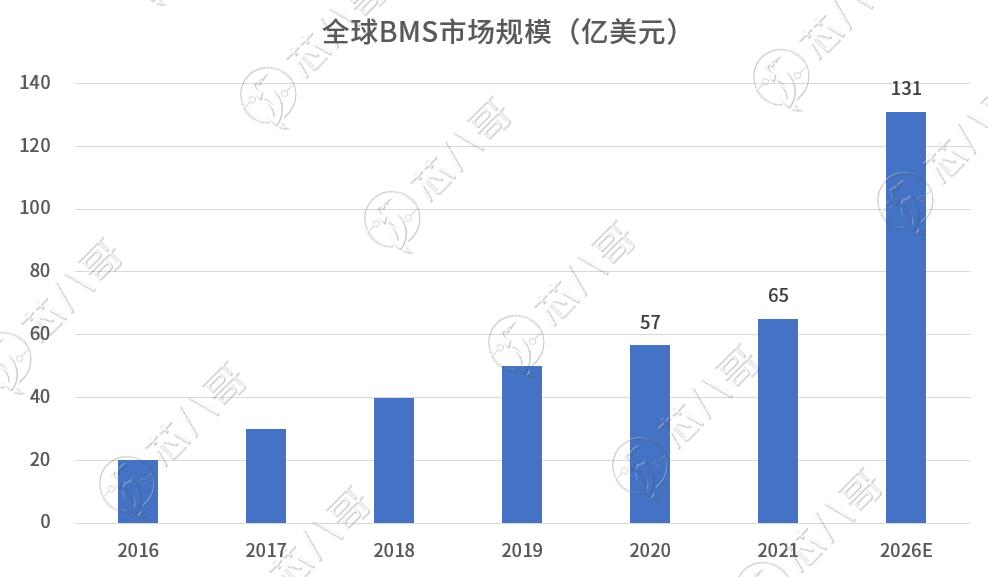 據(jù)前瞻產(chǎn)業(yè)研究院的數(shù)據(jù),2021年全球BMS市場規(guī)模預(yù)計(jì)為65.12億美元,至2026年預(yù)計(jì)可達(dá)131億美元,CAGR為15%。我國BMS 2021年市場需求規(guī)模為100億元,未來隨著電動汽車市場規(guī)模擴(kuò)大和電池效率要求提高,BMS市場規(guī)模有望實(shí)現(xiàn)穩(wěn)定增長。