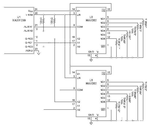 圖1.兩個MAX382多路復用器使該數據采集IC能夠監測更多的溫度。這里,一個與熱敏電阻并聯的100pF電容用于濾除噪聲。