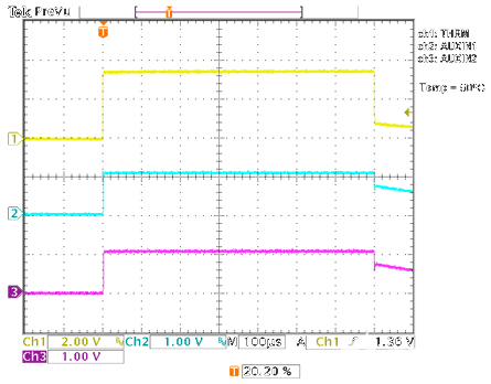 THRM、AUXIN1 和 AUXIN2 波形的示波器(圖 2)顯示,THRM 僅在最大采集時間 (~700μs) 下啟用。此最長時間在此處僅用于說明。采集的實際建立時間可通過軟件編程,應確定,以便AUXIN_電容有足夠的時間建立。