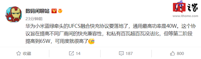 據微博博主 @數碼閑聊站 稱,華為、小米、OPPO、vivo 牽頭的 UFCS 融合快充協議要落地,通用最高功率是 40W。該協議旨在提高不同廠商間的快充兼容性,和私有百瓦超百瓦無法比較,但第二階段會提高到 65W,可用度將變高。