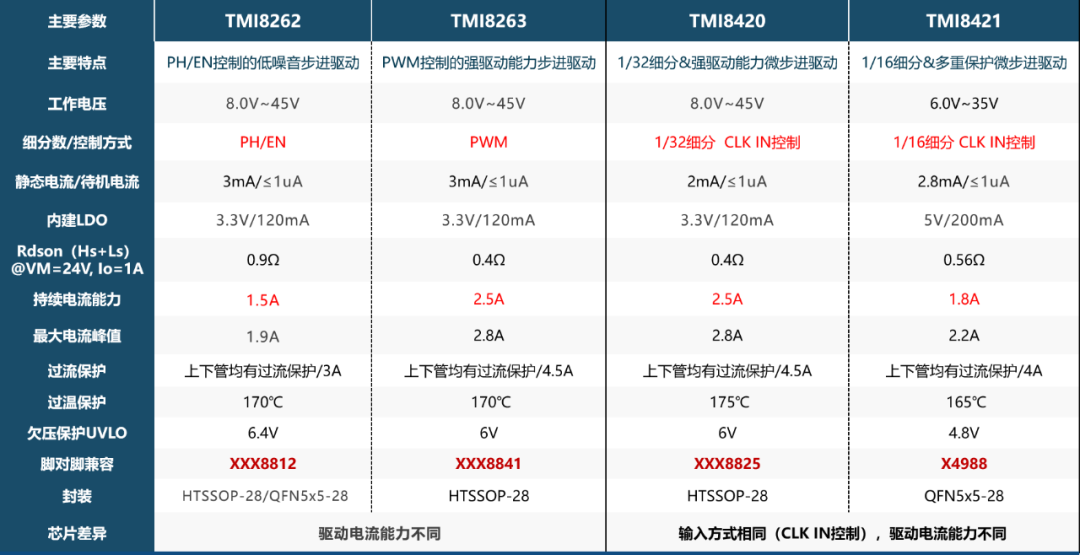 TMI8262是PH/EN控制的低噪音步進驅動,TMI8263是PWM控制的強驅動能力步進驅動。TMI8262和TMI8263主要區別是驅動電流能力不同。TMI8420是1/32細分&強驅動能力微步進驅動,TMI8421是1/16細分&多重保護微步進驅動.TMI8420和TMI8421輸入方式相同,驅動電流能力不同。