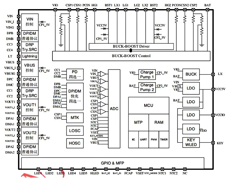IP5389移動電源管理芯片方案,支持充放電應用
