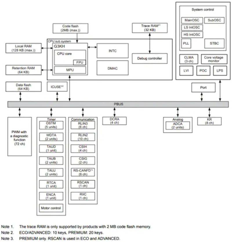 圖4:RH850/F1K芯片框圖 (圖源:貿澤電子)